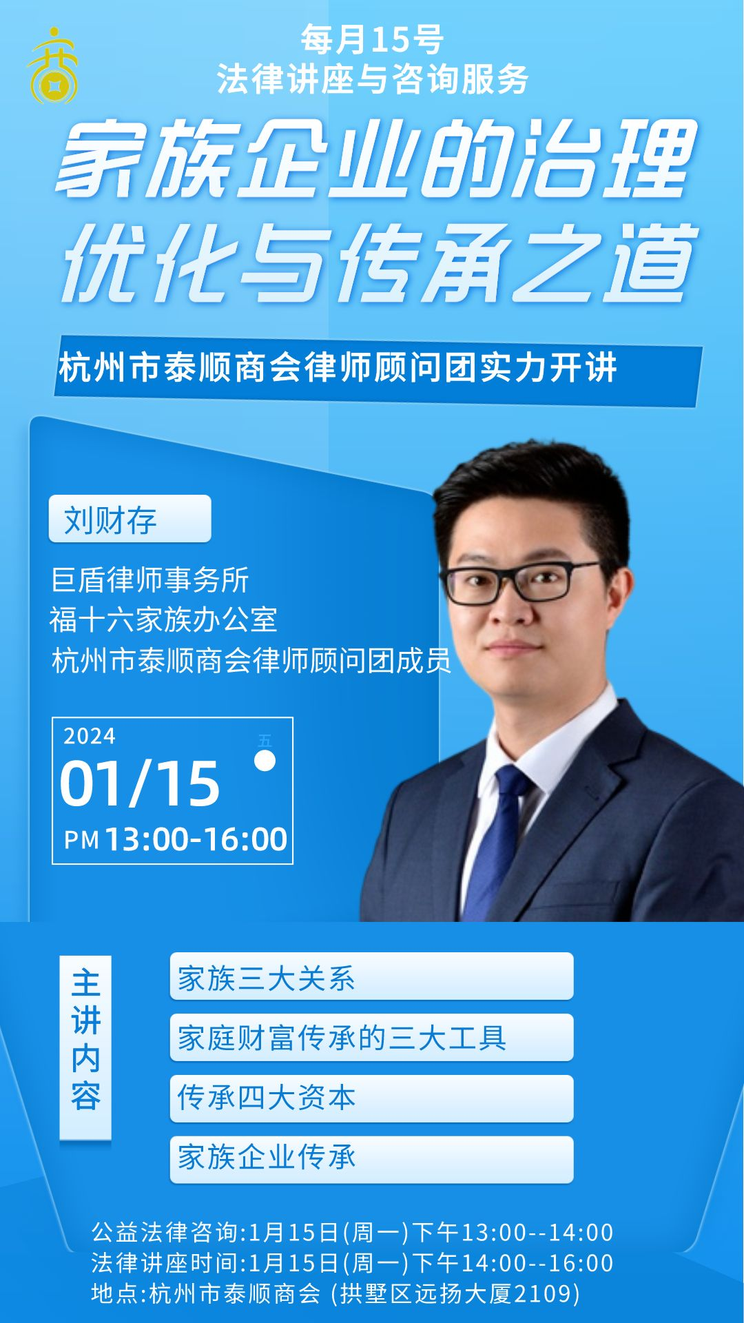 1月15日(周一)下午,杭州市泰顺商会律师顾问团成员刘财存律师将在商会办公室轮值坐班,为商会会员及会员企业提供法律咨询服务。