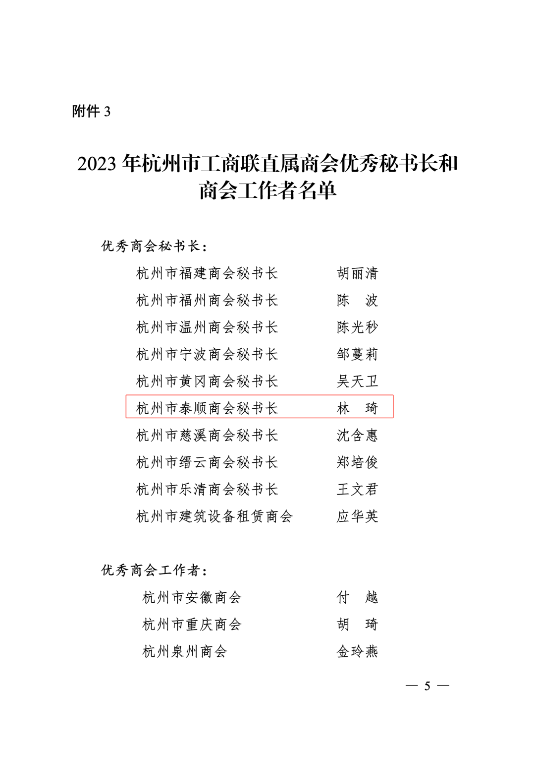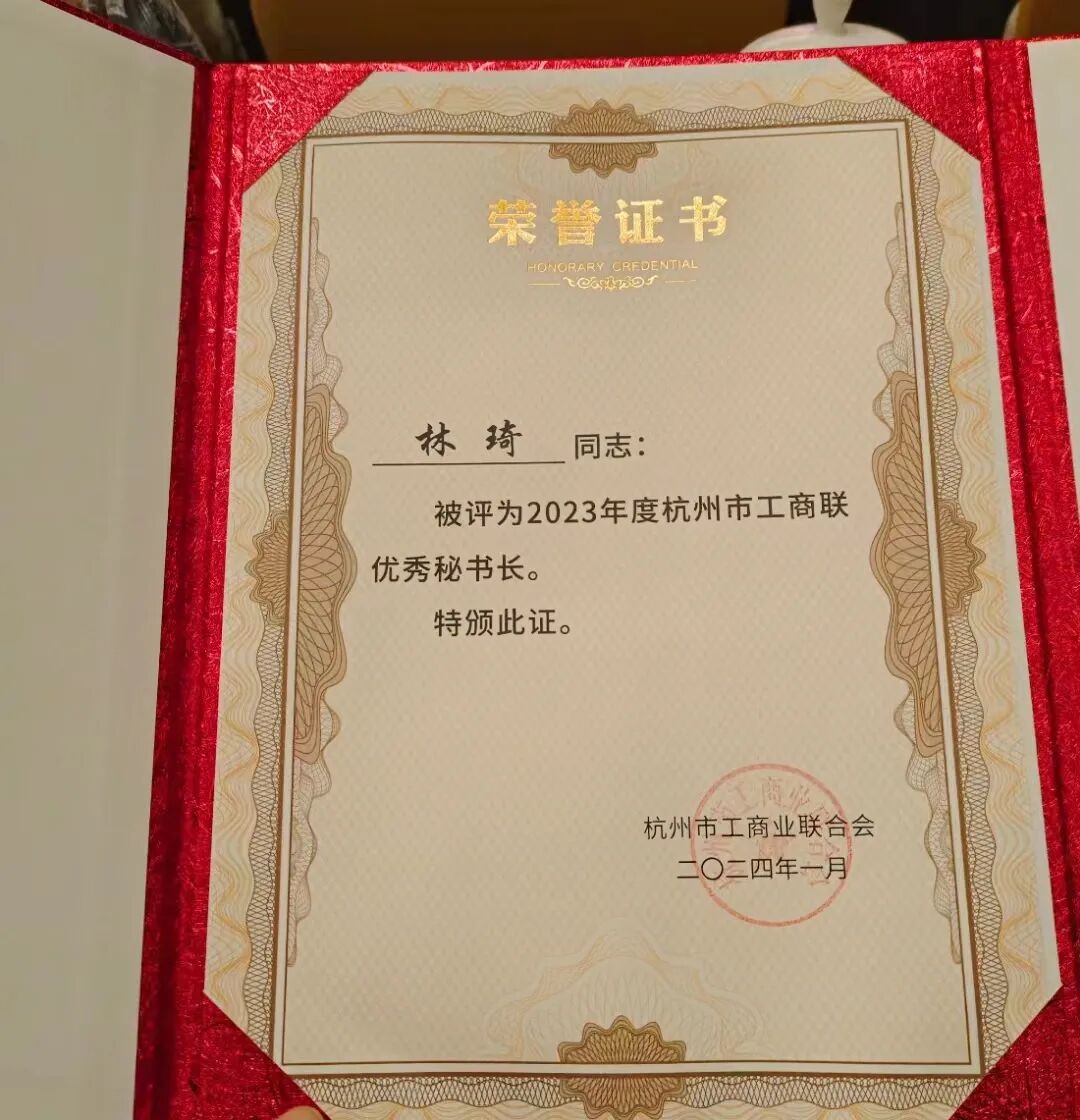 会上,我商会秘书长林琦获评2023年度杭州市工商联优秀商会秘书长;秘书处方淑获评2023年度杭州市工商联优秀商会工作者。